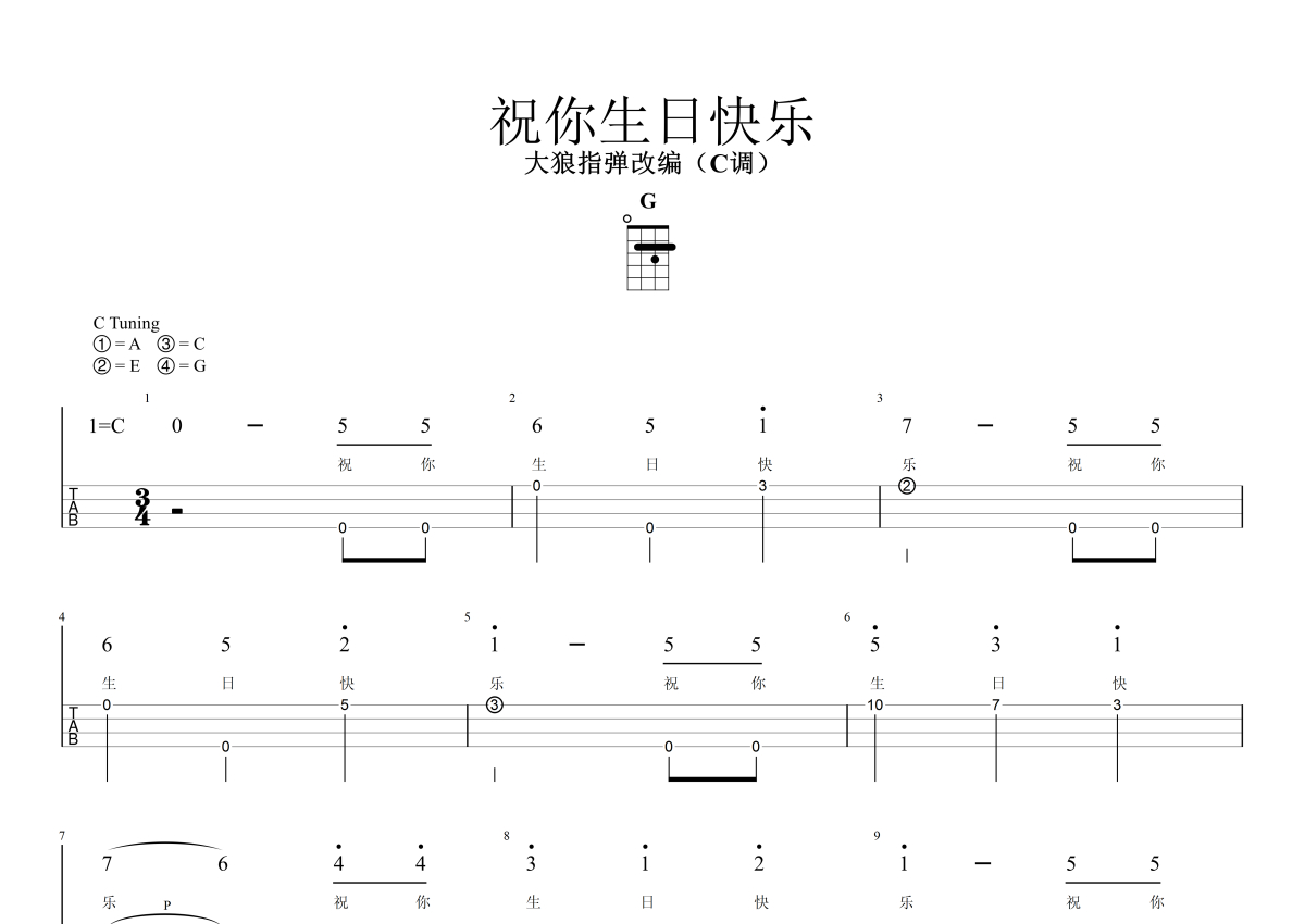 《祝你生日快乐》是儿歌演唱的一首歌曲,指弹,拍号为4/4拍,歌曲速度为每分钟110拍,歌曲原调为C调,本尤克里里谱采用的是C调指法编配,演奏时不需要使用变调夹即为原调,这份尤克里里谱共有一张高清图谱,图谱由 @大狼指弹 编配上传,图谱使用四线谱编配,曲谱配备了相关的视频提供浏览,使用这份祝你生日快乐尤克里里谱,可以让你更加方便地掌握这首歌曲的演奏技巧,快来尝试吧。儿歌《祝你生日快乐》独奏谱,适合尤克里里独奏初学者,尤克里里指弹独奏入门练习曲。