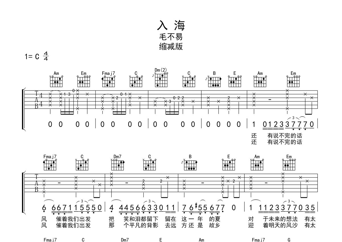 毛不易《入海》吉他谱 - C调弹唱六线谱 - 缩减版