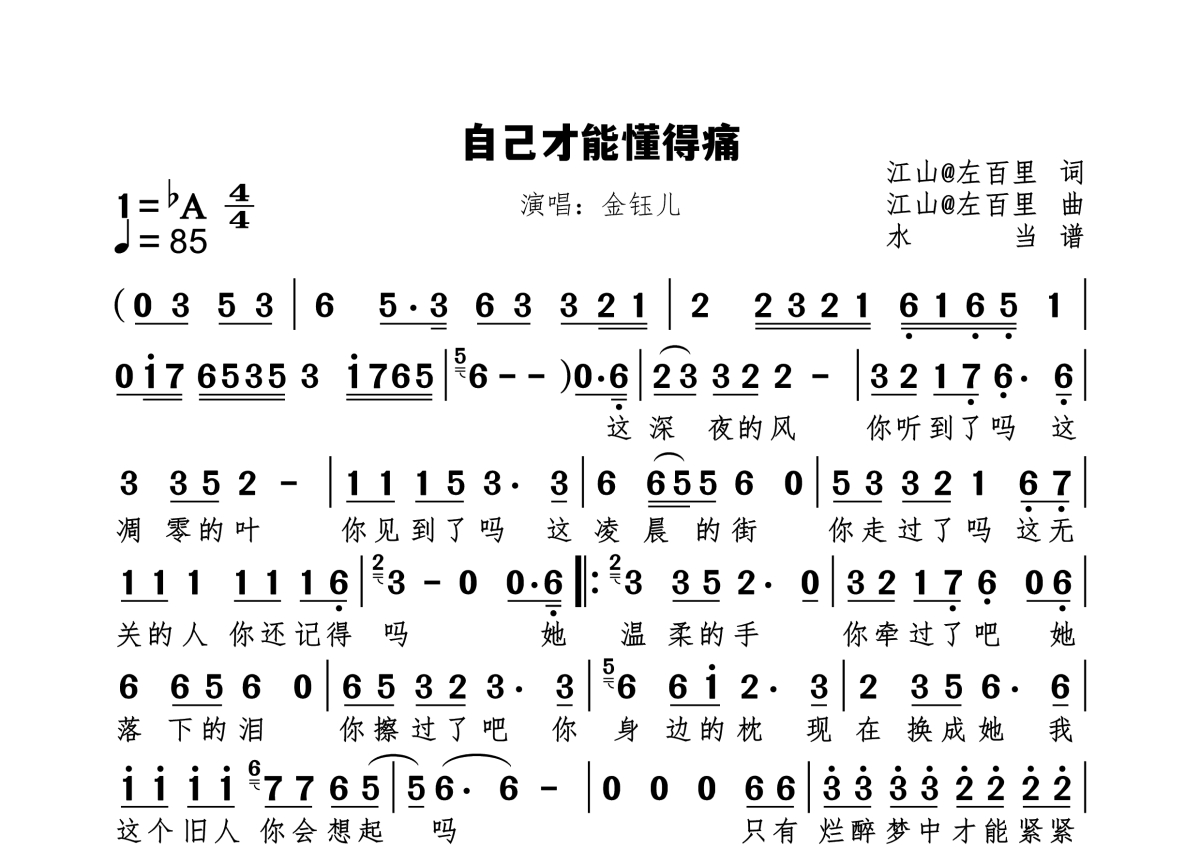 《自己才能懂得痛》是金钰儿演唱的一首歌曲,拍号为4/4拍,歌曲速度为每分钟85拍,这份简谱共有一张高清图谱,图谱由 @水当 编配上传原调bA。