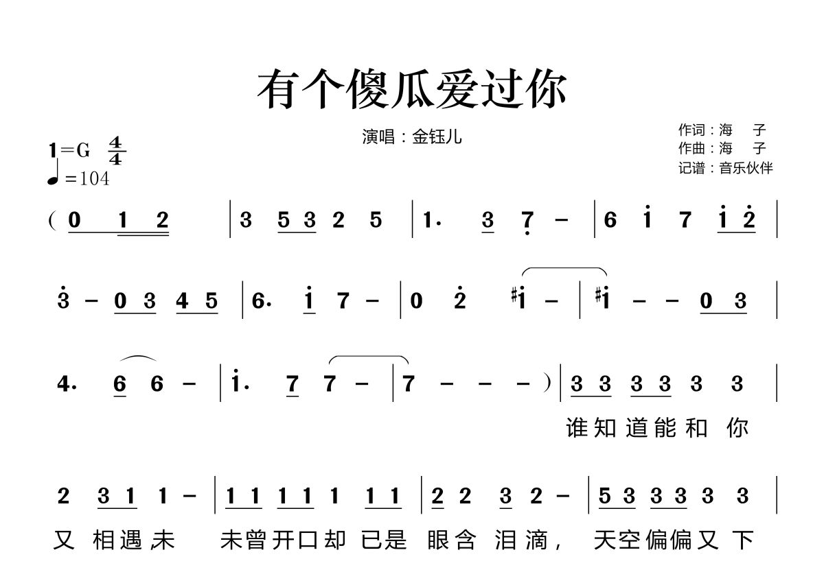 《有个傻瓜爱过你》是金钰儿演唱的一首歌曲,拍号为4/4拍,歌曲速度为每分钟104拍,这份简谱共有两张高清图谱,图谱由 @音乐伙伴 编配上传。