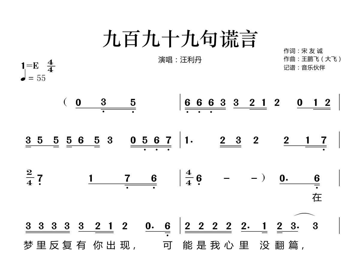 《九百九十九句谎言》是汪利丹演唱的一首歌曲,拍号为4/4拍,歌曲速度为每分钟55拍,这份简谱共有两张高清图谱,图谱由 @音乐伙伴 编配上传。