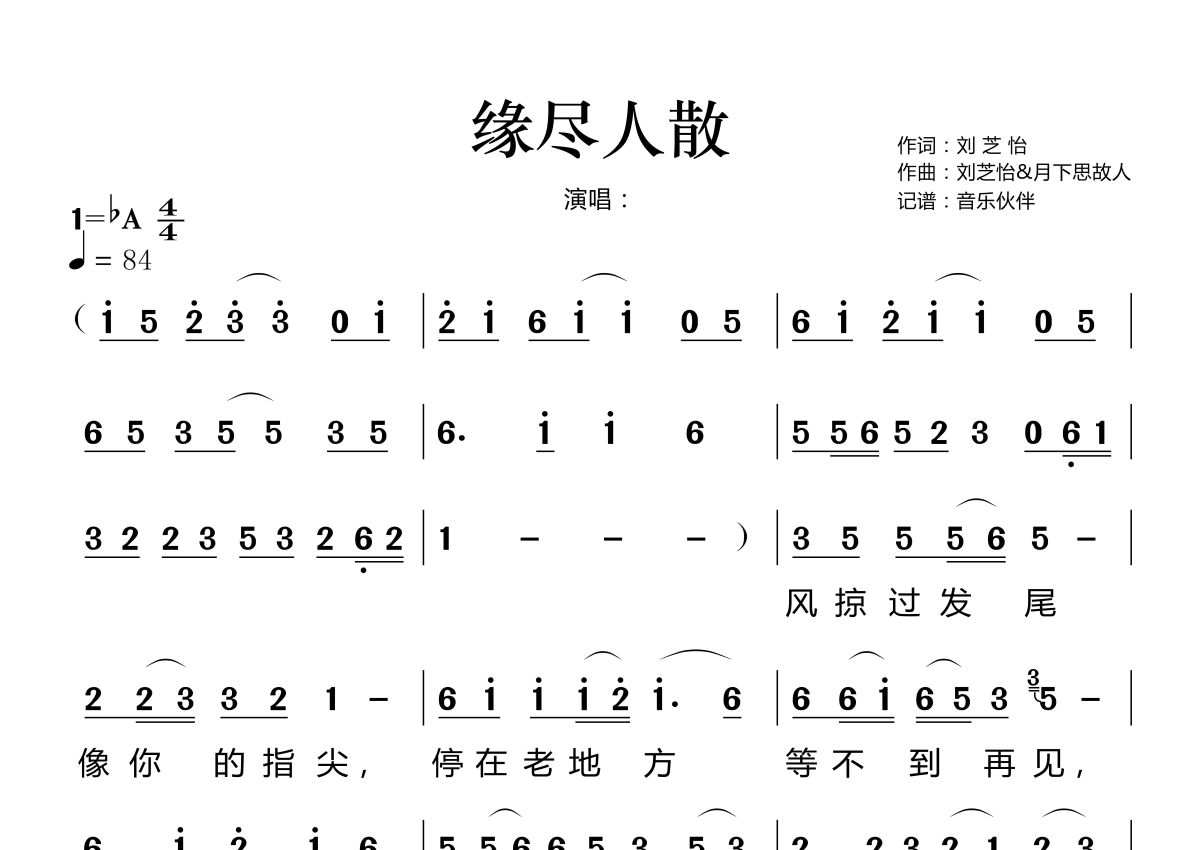《缘尽人散》是王爱华演唱的一首歌曲,拍号为4/4拍,歌曲速度为每分钟84拍,这份简谱共有两张高清图谱,图谱由 @音乐伙伴 编配上传。