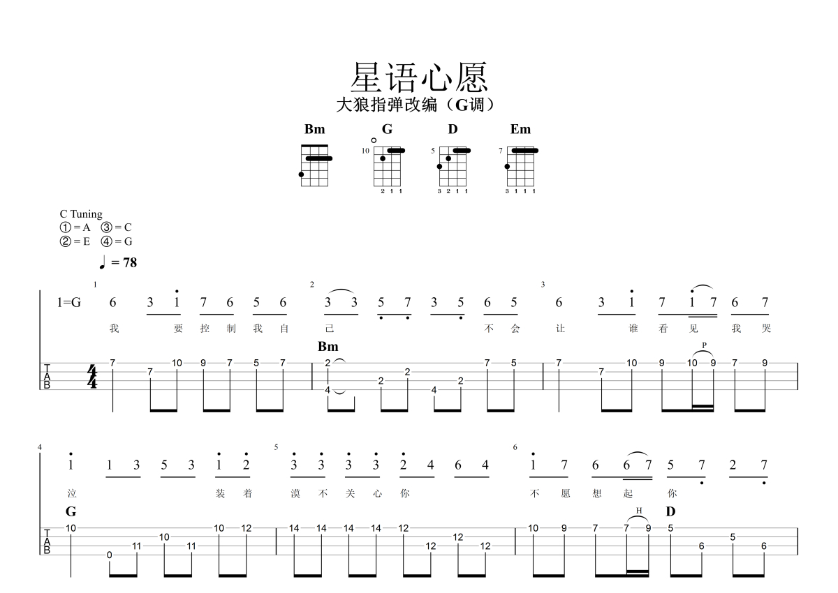 《心语星愿》是张柏芝演唱的一首歌曲,指弹,本尤克里里谱采用的是G调指法编配,这份尤克里里谱共有两张高清图谱,图谱由 @大狼指弹 编配上传,图谱使用四线谱编配,曲谱配备了相关的音频提供试听,使用这份心语星愿尤克里里谱,可以让你更加方便地掌握这首歌曲的演奏技巧,快来尝试吧。《星语心愿》尤克里里指弹独奏谱,G调指法编配。