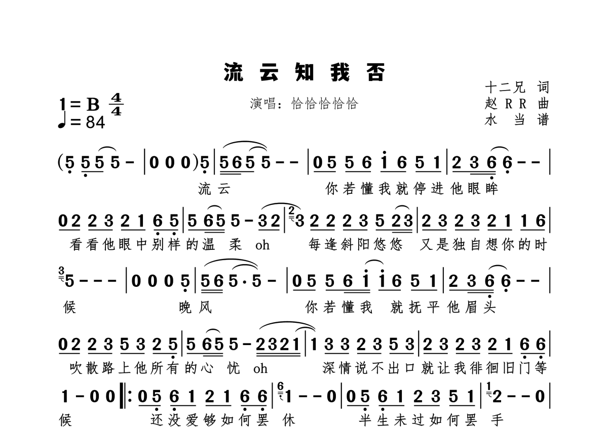 《流云知我否》是恰恰恰恰恰演唱的一首歌曲,拍号为4/4拍,歌曲速度为每分钟84拍,这份简谱共有一张高清图谱,图谱由 @水当 编配上传原调B。