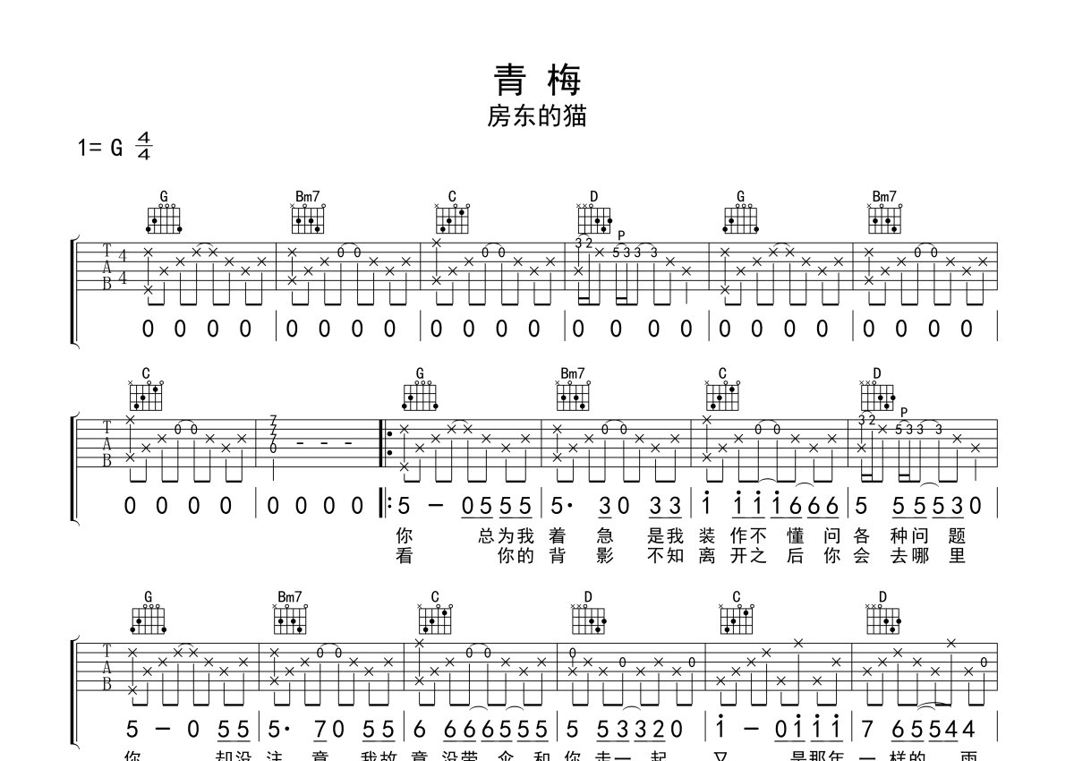 房东的猫《青梅》吉他谱 - G调弹唱六线谱