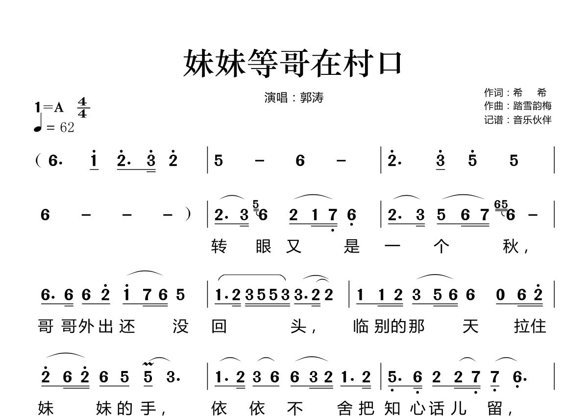 妹妹等哥在村口简谱 - 郭涛演唱