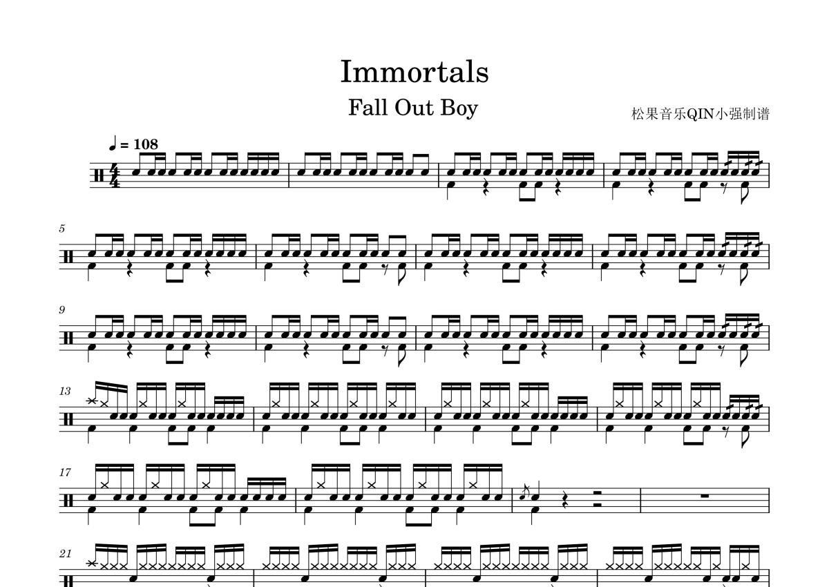 《Immortals》是Fall Out Boy演唱的一首歌曲,拍号为4/4拍,这份架子鼓谱共有两张高清图谱,图谱由 @松果音乐QIN小强 编配上传,图谱使用五线谱编配,使用这份Immortals架子鼓谱,你将能够轻松地敲打出这首Fall Out Boy的Immortals,快来尝试吧。《Immortals》是迪士尼电影《超能陆战队》的主题曲,该曲由Fall Out Boy乐队作曲、编曲、演唱,收录在2014年10月14日发行的同名原声专辑和Fall Out Boy2015年01月20日发行的第六张录音室专辑《American Beauty / American Psycho》中。