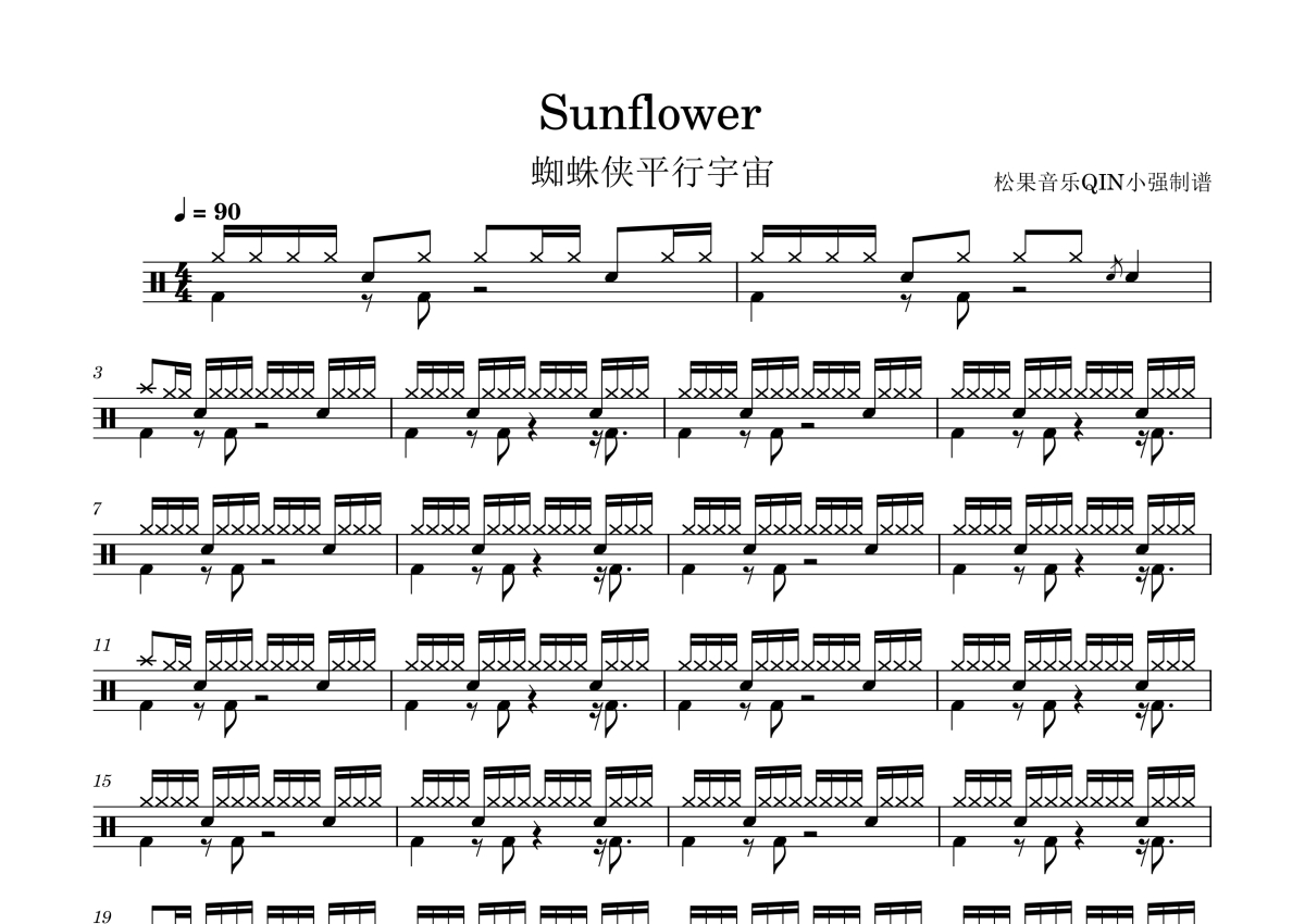 《Sunflower》是波兹·马龙,斯·李共演唱的一首歌曲,这份架子鼓谱共有两张高清图谱,图谱由 @松果音乐QIN小强 编配上传,图谱使用五线谱编配,使用这份Sunflower架子鼓谱,你将能够轻松地敲打出这首波兹·马龙,斯·李共的Sunflower,快来尝试吧。《Sunflower》是波兹·马龙和斯·李共同演唱的歌曲,由波兹·马龙、斯·李、Carter Lang、Carl Rosen、Billy Walsh、路易斯·贝尔共同创作,是电影《蜘蛛侠:平行宇宙》的主题曲,于2018年10月18日作为单曲发行,后收录于波兹·马龙第三张录音室专辑《Hollywood's Bleeding》中。
