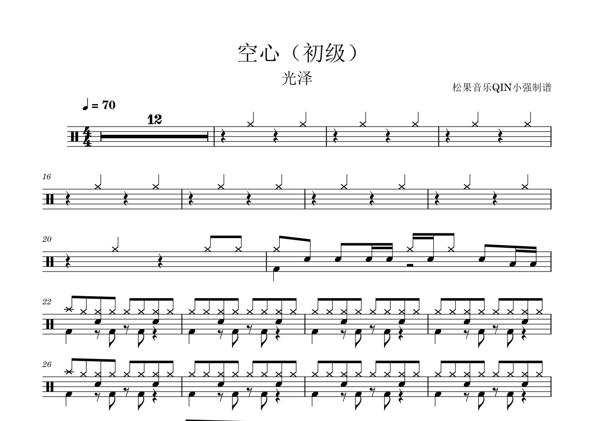 《空心(初级)》是初级演唱的一首歌曲,拍号为4/4拍,这份架子鼓谱共有两张高清图谱,图谱由 @松果音乐QIN小强 编配上传,图谱使用五线谱编配,使用这份空心(初级)架子鼓谱,你将能够轻松地敲打出这首初级的空心(初级),快来尝试吧。《空心》是由泽光(G.Z)演唱的一首歌曲 。收录于星创世纪娱乐公司2016年10月21日发行的同名专辑《光泽》中。