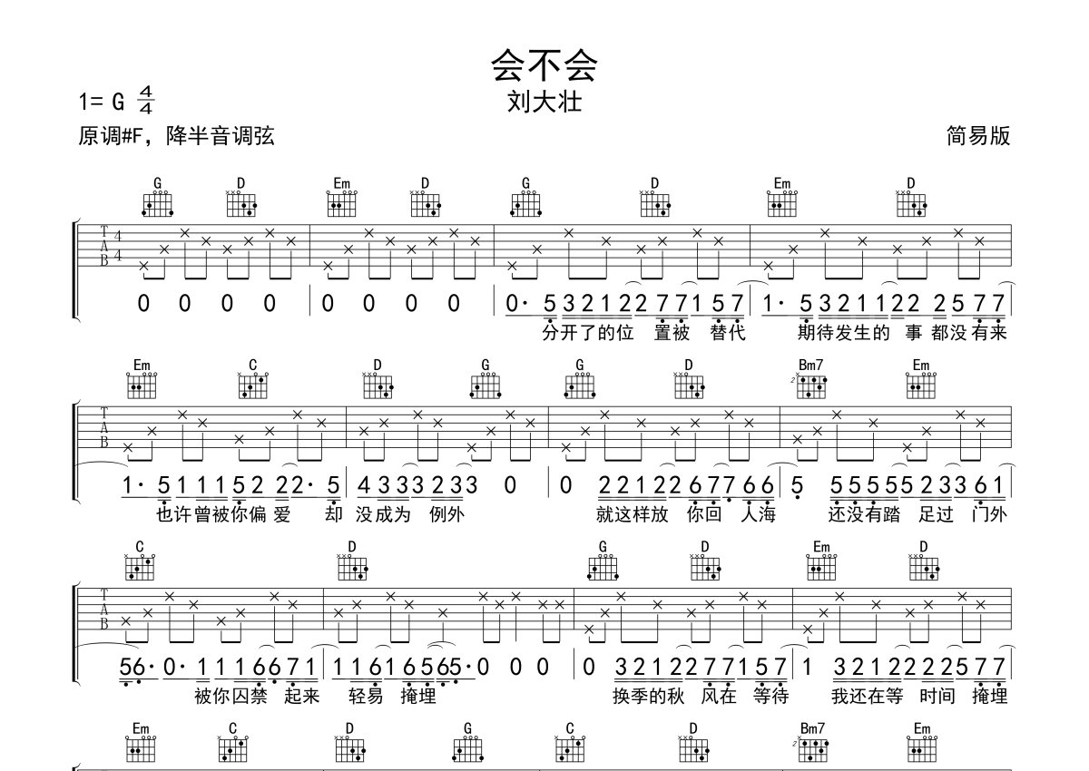 刘大壮《会不会》吉他谱 - G调弹唱六线谱 - 简易版