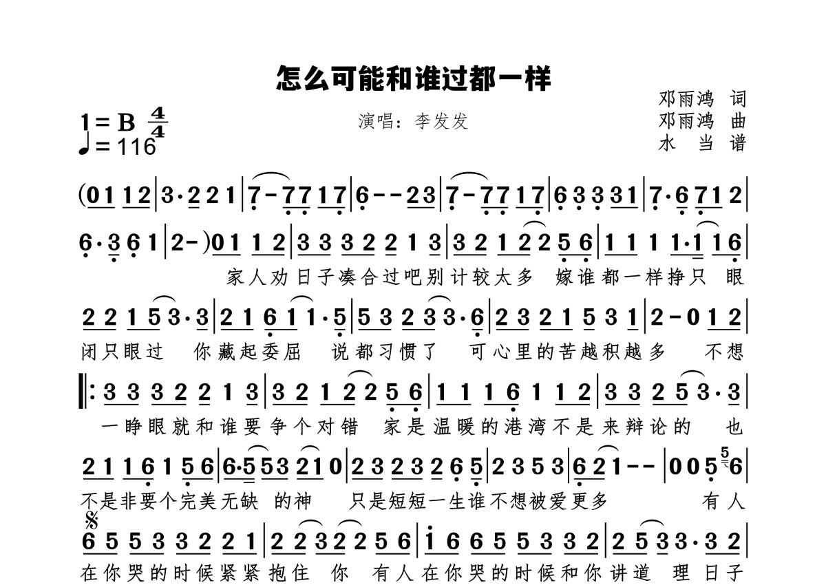 《怎么可能和谁过都一样》是李发发演唱的一首歌曲,拍号为4/4拍,歌曲速度为每分钟116拍,这份简谱共有一张高清图谱,图谱由 @水当 编配上传原调B。