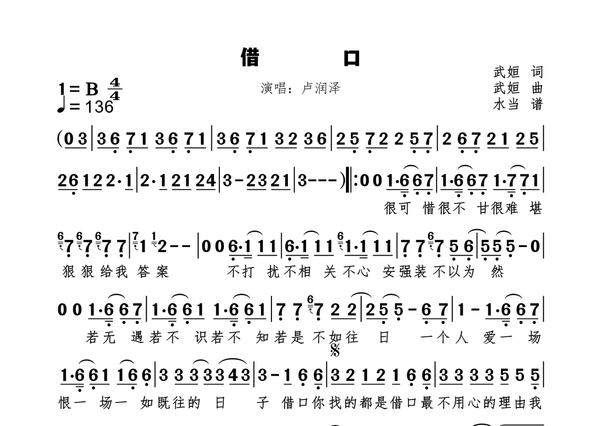 《借口》是卢润泽演唱的一首歌曲,拍号为4/4拍,歌曲速度为每分钟136拍,这份简谱共有一张高清图谱,图谱由 @水当 编配上传原调B。