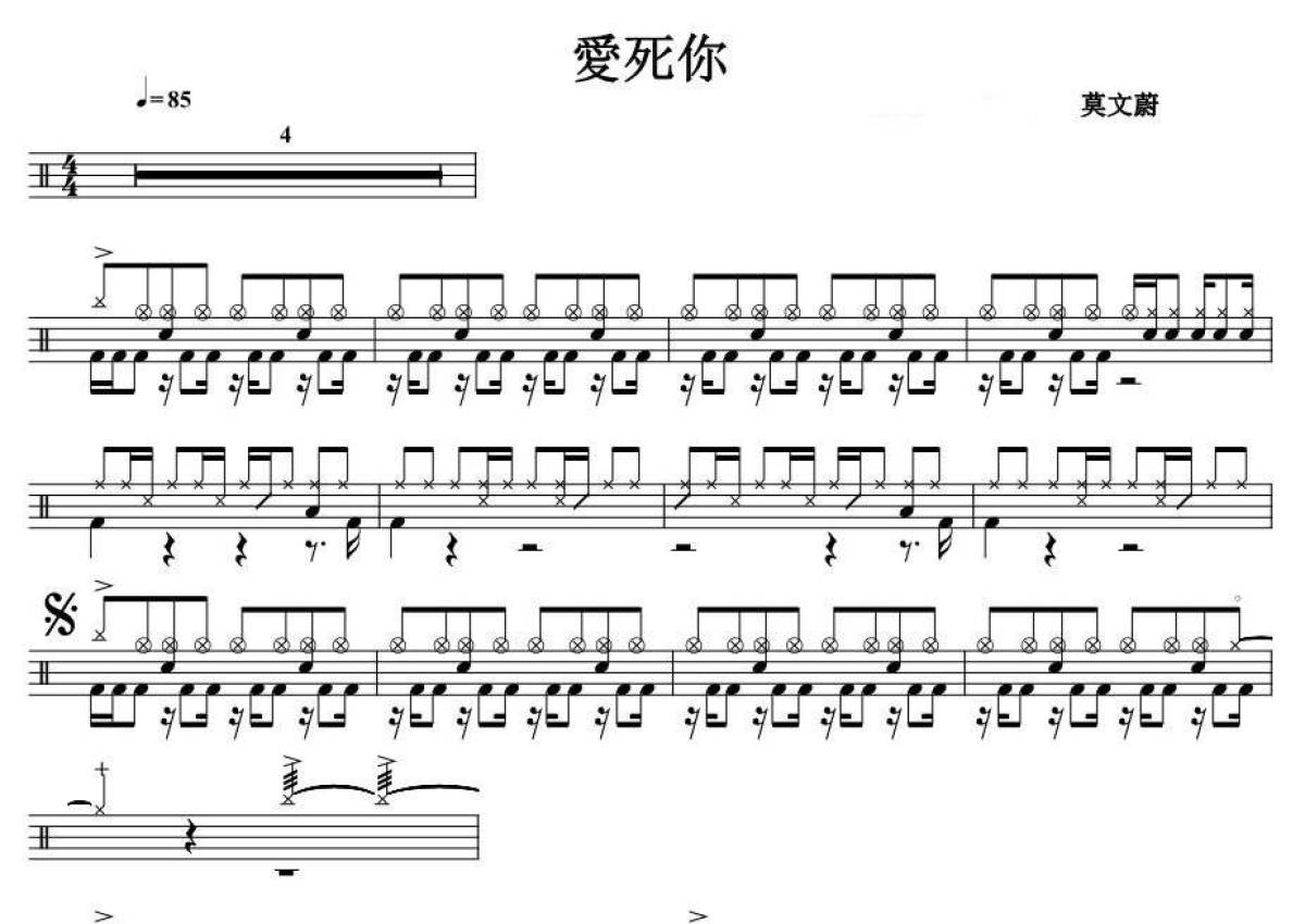 《爱死你》是莫文蔚演唱的一首歌曲,拍号为4/4拍,歌曲速度为每分钟85拍,这份架子鼓谱共有两张高清图谱,图谱由 @音符喷血者 编配上传,图谱使用五线谱编配,使用这份爱死你架子鼓谱,你将能够轻松地敲打出这首莫文蔚的爱死你,快来尝试吧。