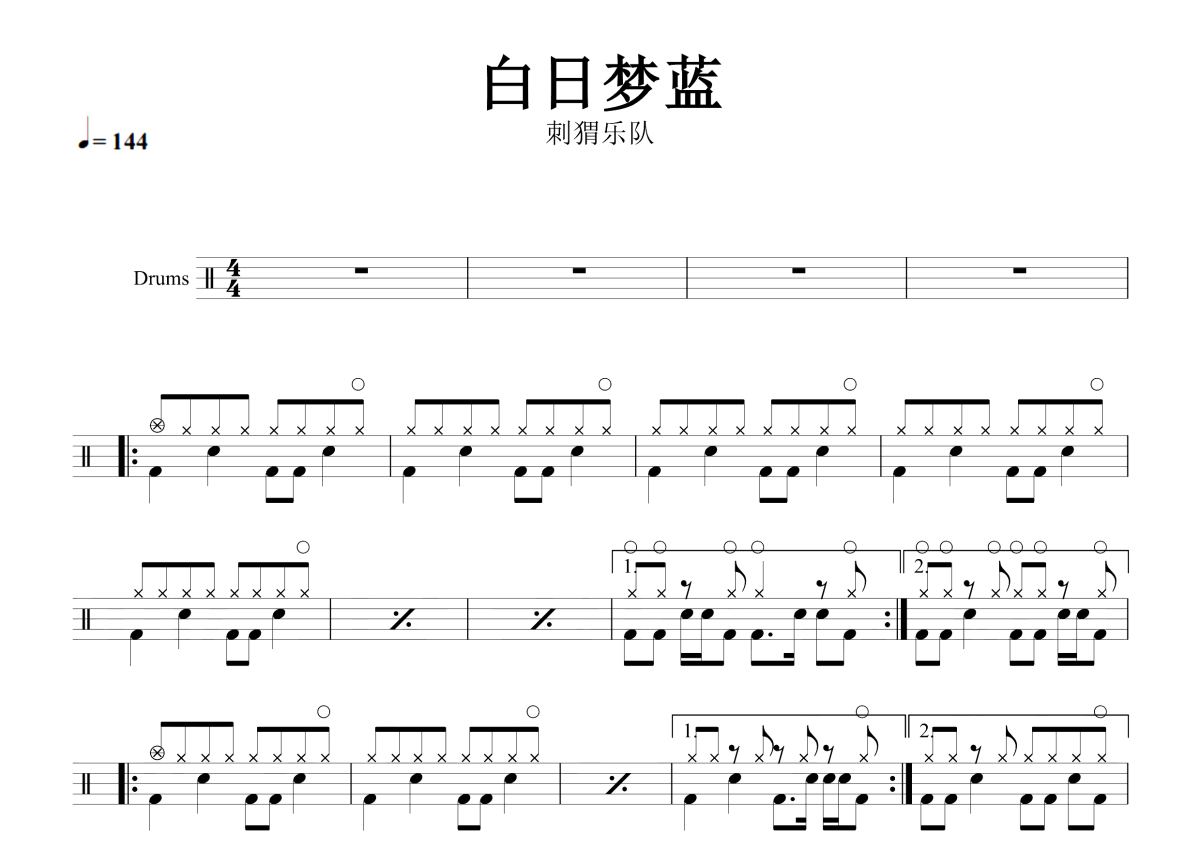 《白日梦蓝》是刺猬乐队演唱的一首歌曲,拍号为4/4拍,歌曲速度为每分钟144拍,这份架子鼓谱共有四张高清图谱,图谱由 @音符喷血者 编配上传,图谱使用五线谱编配,使用这份白日梦蓝架子鼓谱,你将能够轻松地敲打出这首刺猬乐队的白日梦蓝,快来尝试吧。