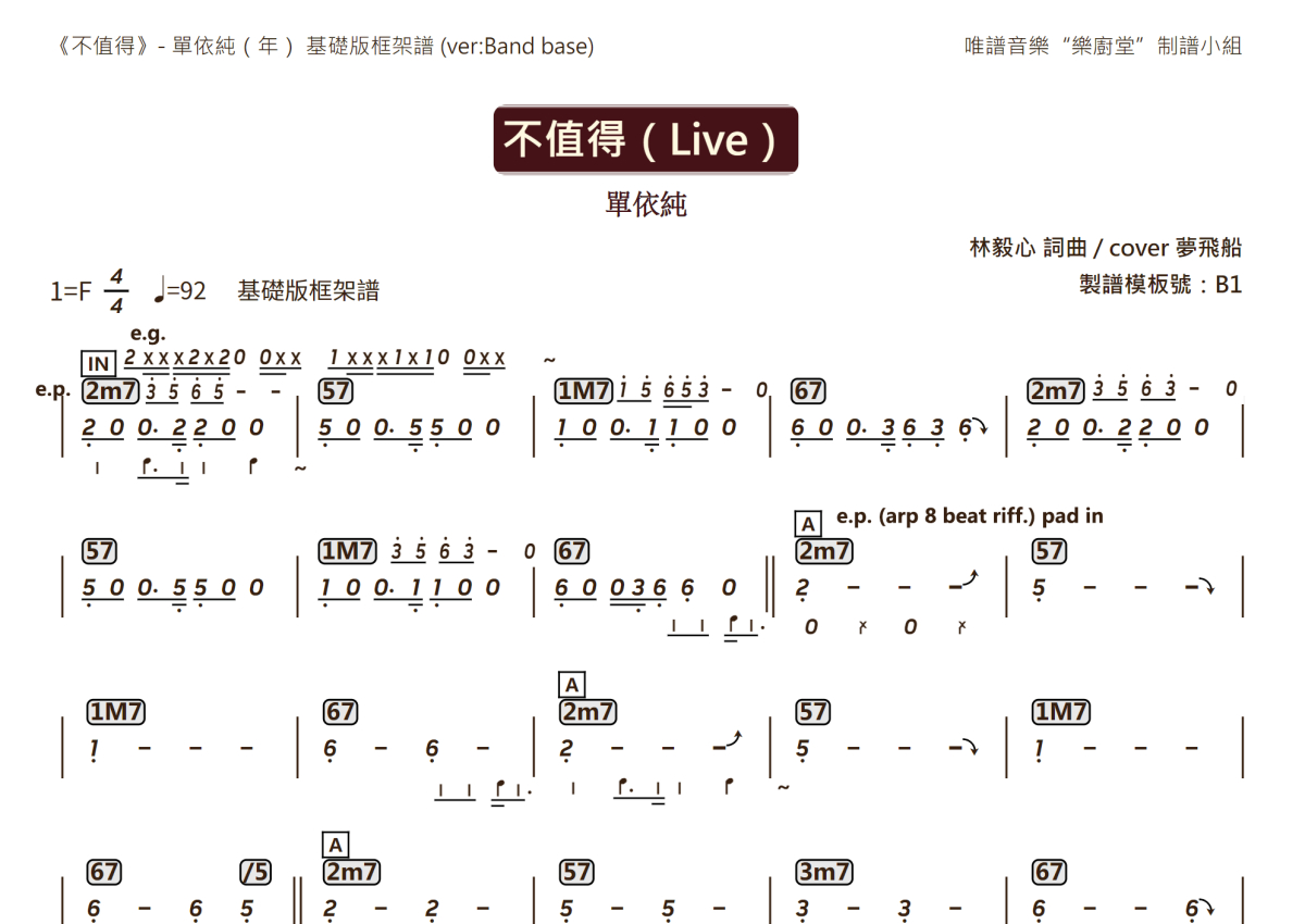 《不值得(Live)》是Live演唱的一首歌曲,基础框架贝斯鼓谱,这份乐队总谱共有两张高清图谱,图谱由 @唯谱音乐"乐厨堂"发布小组 编配上传。