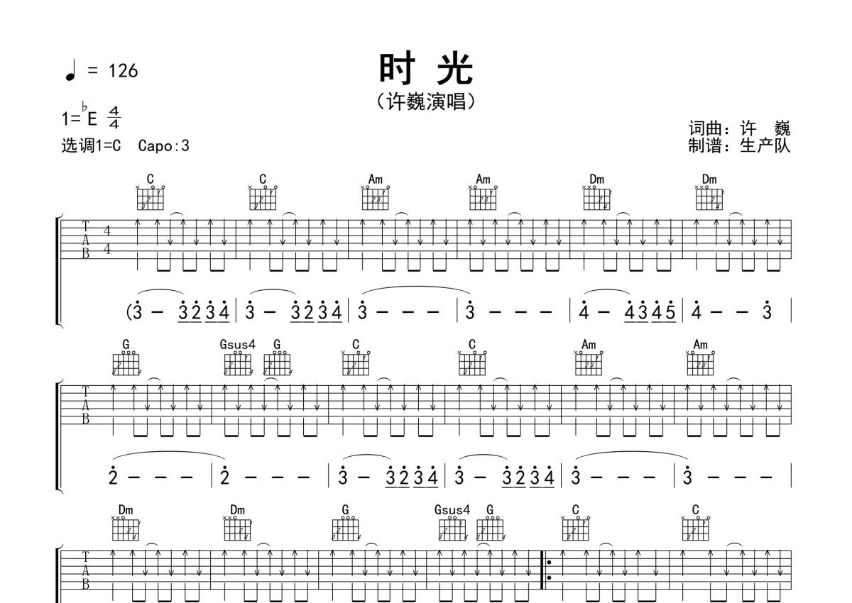 《时光》是许巍演唱的一首歌曲,免翻页版,拍号为4/4拍,歌曲速度为每分钟126拍,歌曲原调为Eb调,但由于原调指法比较难,为了方便弹奏,本吉他谱采用的是C调指法编配,变调夹3品弹奏即为原调,当然也可以根据自己的音域改变变调夹位置,或者通过改变和弦调性,以方便自己弹奏,这份吉他谱共有两张高清图谱,图谱由 @生产队 编配上传,图谱使用六线谱编配,包含吉他和弦指法、简谱以及歌词部分,使用这份时光吉他谱,可以让你更加方便地掌握这首歌曲的弹唱技巧,快来尝试吧。许巍演唱的经典歌曲《时光》原版吉他谱,含前奏、间奏、尾奏solo编配,免翻页版,怀旧经典!。