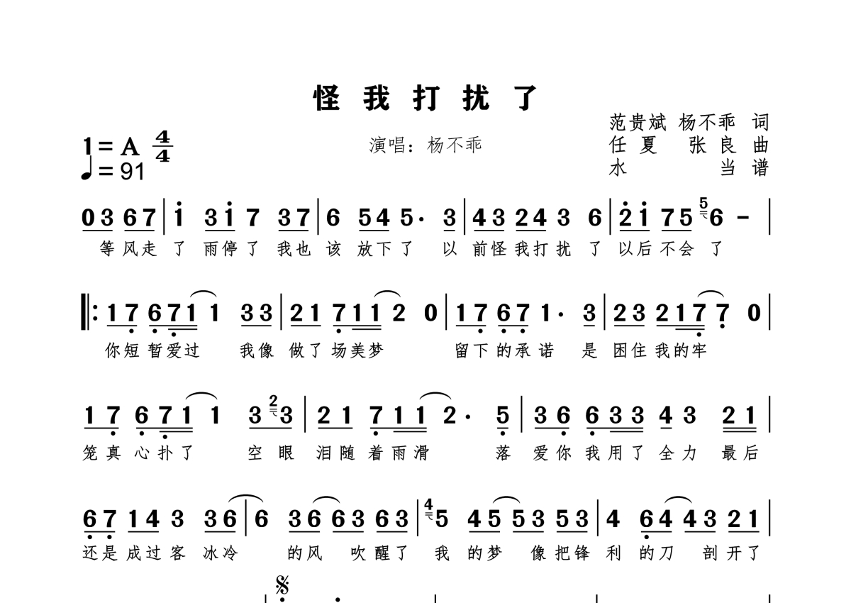 《怪我打扰了》是杨不乖演唱的一首歌曲,拍号为4/4拍,歌曲速度为每分钟91拍,这份简谱共有一张高清图谱,图谱由 @水当 编配上传原调A。