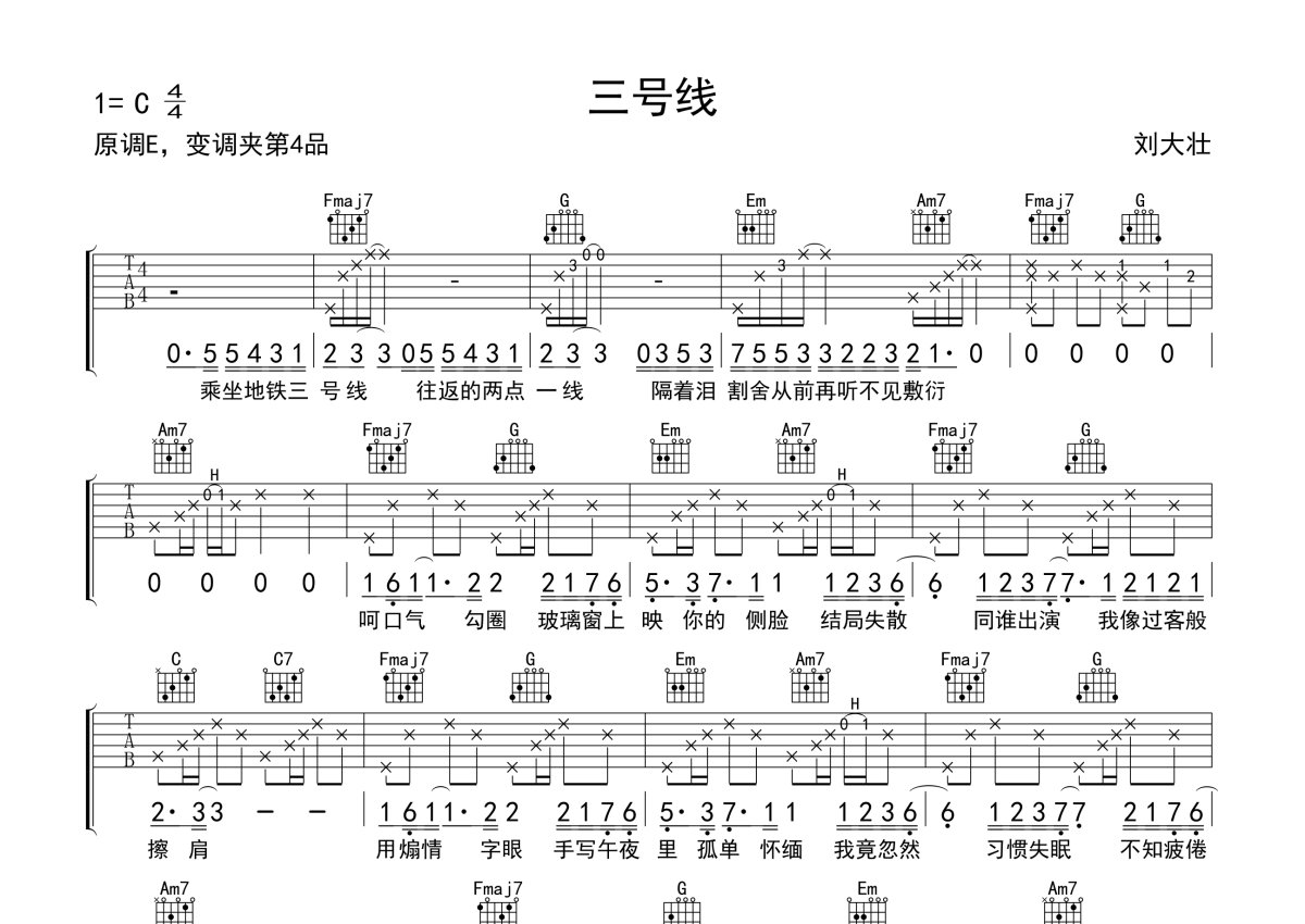 刘大壮《三号线》吉他谱 - C调弹唱六线谱