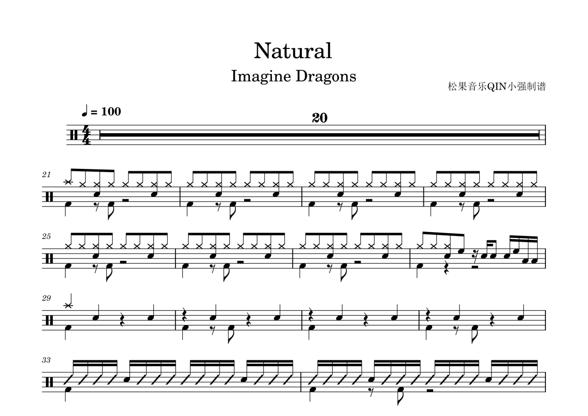 《Natural》是Imagine Dragons演唱的一首歌曲,拍号为4/4拍,这份架子鼓谱共有两张高清图谱,图谱由 @松果音乐QIN小强 编配上传,图谱使用五线谱编配,使用这份Natural架子鼓谱,你将能够轻松地敲打出这首Imagine Dragons的Natural,快来尝试吧。《Natural》是美国摇滚乐队Imagine Dragons演唱的歌曲,由丹·雷诺斯、本·麦基、韦恩·瑟蒙、丹尼尔·普拉兹曼、Mattman & Robin、贾斯汀·特兰特创作词曲并制作音乐,收录于Imagine Dragons发行的第四张录音室专辑《Origins》,于2018年7月17日通过环球音乐集团发行。