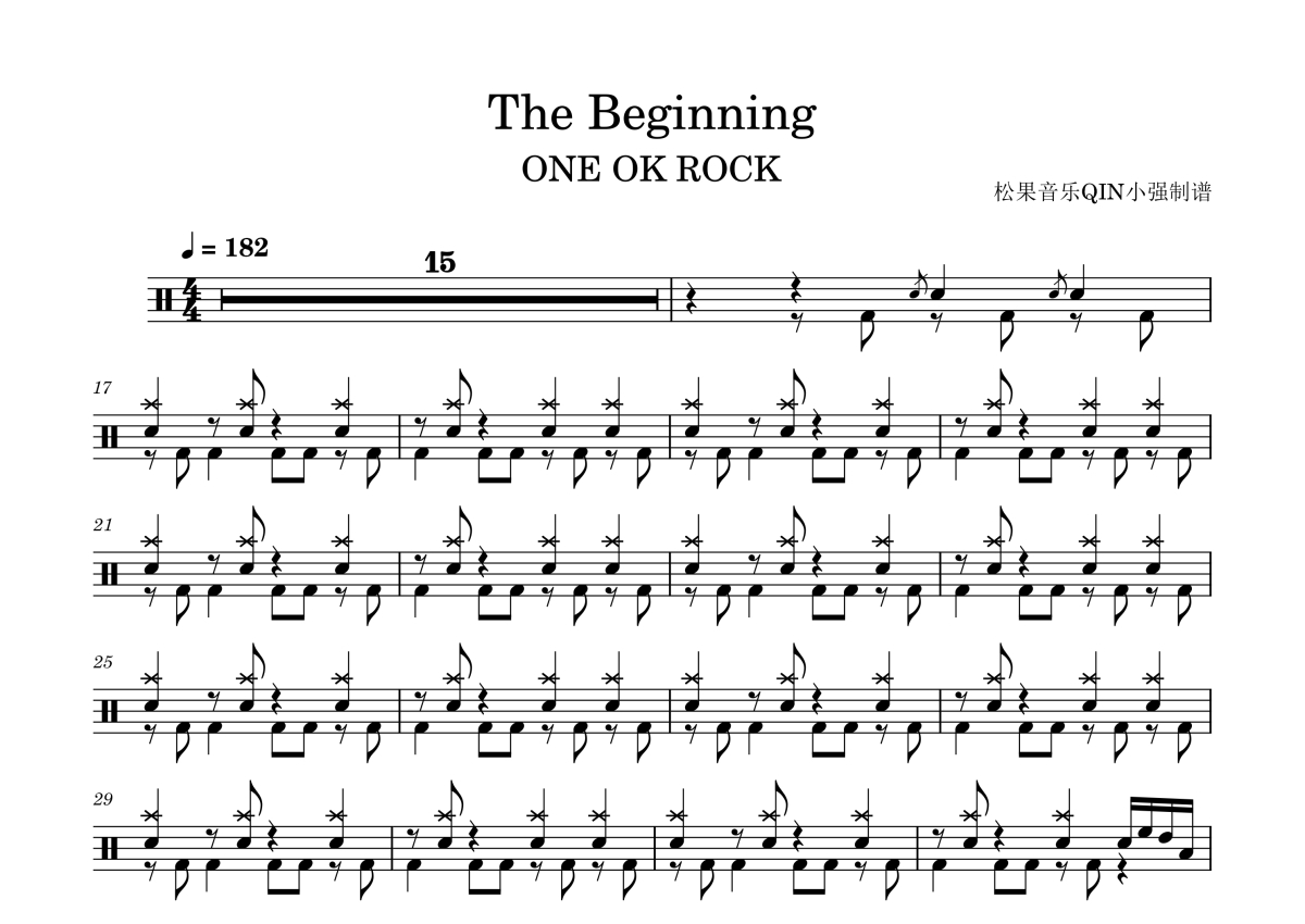 《The Beginning》是ONE OK ROCK演唱的一首歌曲,拍号为4/4拍,这份架子鼓谱共有五张高清图谱,图谱由 @松果音乐QIN小强 编配上传,图谱使用五线谱编配,使用这份The Beginning架子鼓谱,你将能够轻松地敲打出这首ONE OK ROCK的The Beginning,快来尝试吧。《The Beginning》是日本摇滚乐队ONE OK ROCK创作的歌曲,后与Against the Current合作推出英语翻唱版本,收录于2015年发行的专辑《The beginning (Against the current cover.)》 。作品结合日英双语歌词与摇滚乐风格,以高强度的节奏编排和情感化演唱为特色。