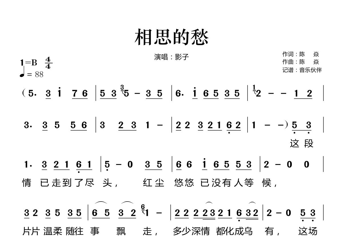 《相思的愁》是影子演唱的一首歌曲,拍号为4/4拍,歌曲速度为每分钟88拍,这份简谱共有两张高清图谱,图谱由 @音乐伙伴 编配上传。