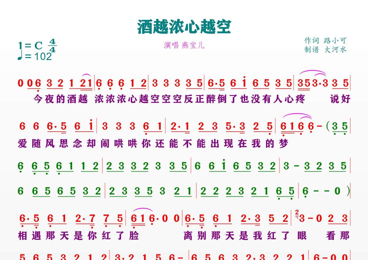 《酒越浓心越空》是燕宝儿演唱的一首歌曲,拍号为4/4拍,歌曲速度为每分钟102拍,这份简谱共有一张高清图谱,图谱由 @临海雪原 编配上传。