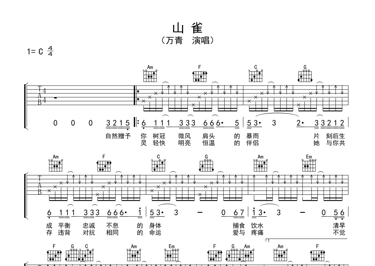 《山雀》是万能青年旅店演唱的一首歌曲,本吉他谱采用的是C调指法编配,这份吉他谱共有两张高清图谱,图谱由 @吉他专家 编配上传,图谱使用六线谱编配,包含吉他和弦指法、简谱以及歌词部分,使用这份山雀吉他谱,可以让你更加方便地掌握这首歌曲的弹唱技巧,快来尝试吧。万青新专《冀西南林路行》终于来了,曲子轻快明亮,适合弹唱。山雀吉他弹唱谱,C调和弦,右手节奏型参看图片谱标注,歌曲让我想起揪心的玩笑和漫长的白日梦,不万能的喜剧。很多扫弦换和弦是上扫的那个拍点,听听原版然后看图片谱标的位置感觉下,间奏我简单写了一下,先听着不违和即可。