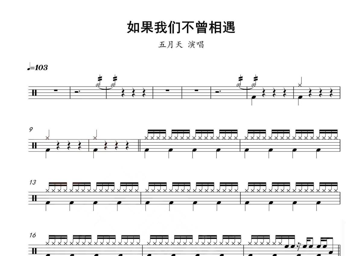 《如果我们不曾相遇》是五月天演唱的一首歌曲,拍号为4/4拍,歌曲速度为每分钟103拍,这份架子鼓谱共有三张高清图谱,图谱由 @音符喷血者 编配上传,图谱使用五线谱编配,使用这份如果我们不曾相遇架子鼓谱,你将能够轻松地敲打出这首五月天的如果我们不曾相遇,快来尝试吧。