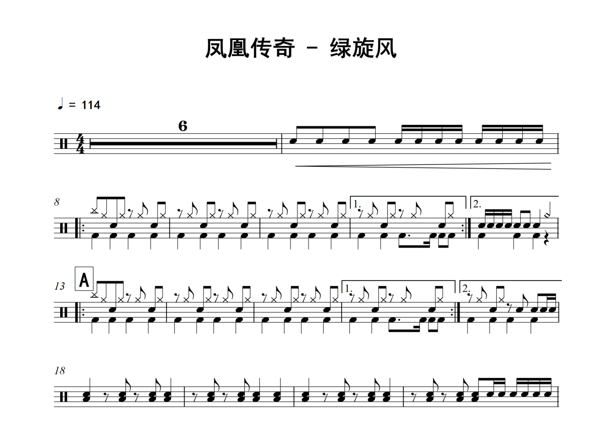 《绿旋风》是凤凰传奇演唱的一首歌曲,拍号为4/4拍,歌曲速度为每分钟114拍,这份架子鼓谱共有两张高清图谱,图谱由 @老虎不说谎 编配上传,图谱使用五线谱编配,使用这份绿旋风架子鼓谱,你将能够轻松地敲打出这首凤凰传奇的绿旋风,快来尝试吧。