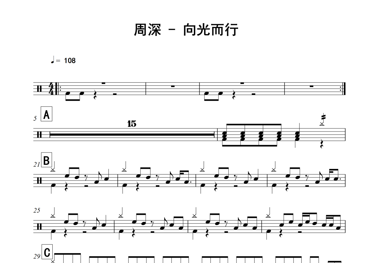 《向光而行》是周深演唱的一首歌曲,拍号为4/4拍,歌曲速度为每分钟108拍,这份架子鼓谱共有两张高清图谱,图谱由 @老虎不说谎 编配上传,图谱使用五线谱编配,使用这份向光而行架子鼓谱,你将能够轻松地敲打出这首周深的向光而行,快来尝试吧。