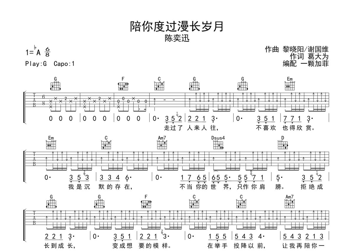陪你度过漫长岁月吉他谱 - 陈奕迅演唱 - G调弹唱六线谱