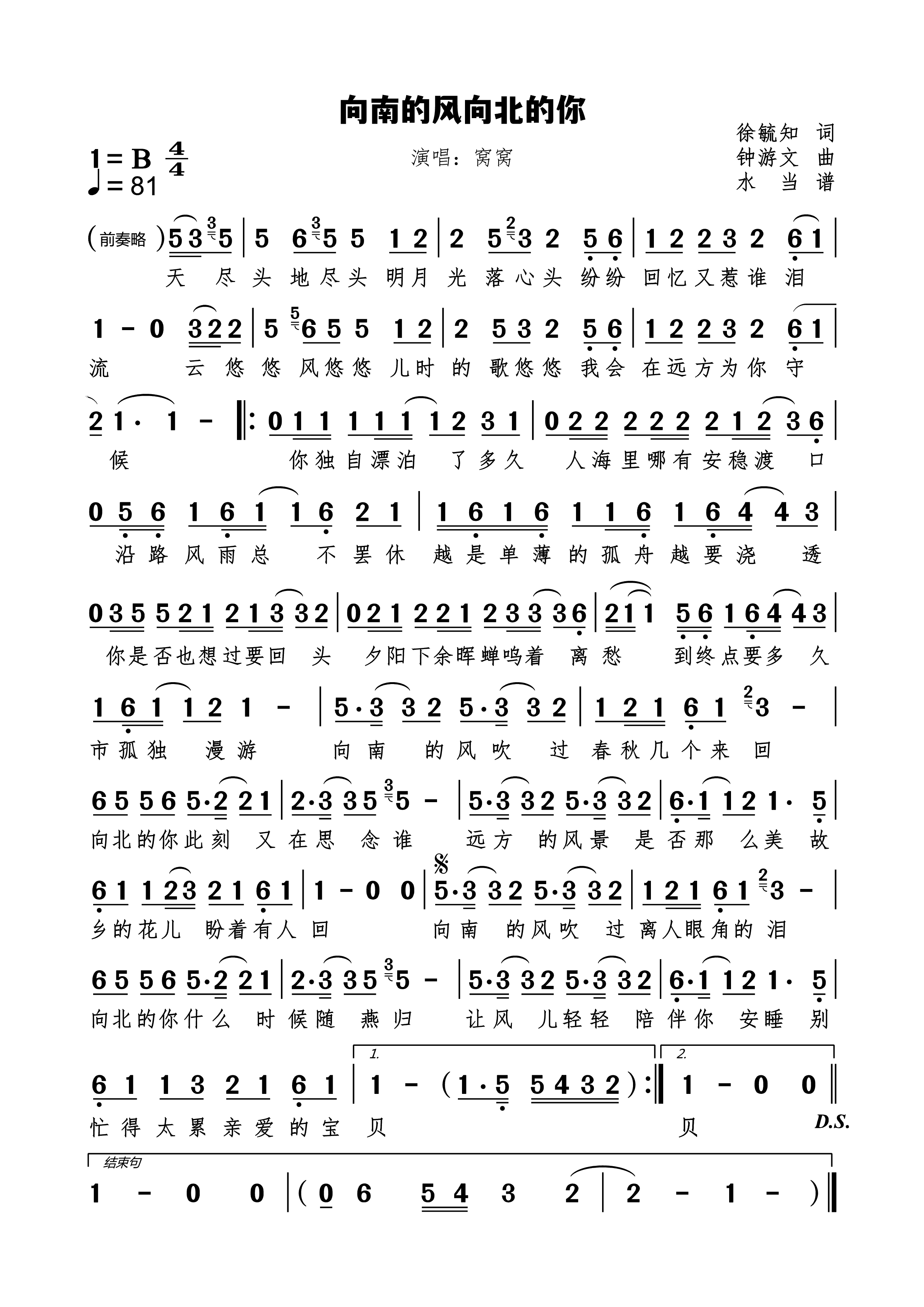 《向南的风向北的你》是窝窝演唱的一首歌曲,拍号为4/4拍,歌曲速度为每分钟81拍,这份简谱共有一张高清图谱,图谱由 @水当 编配上传原调B。