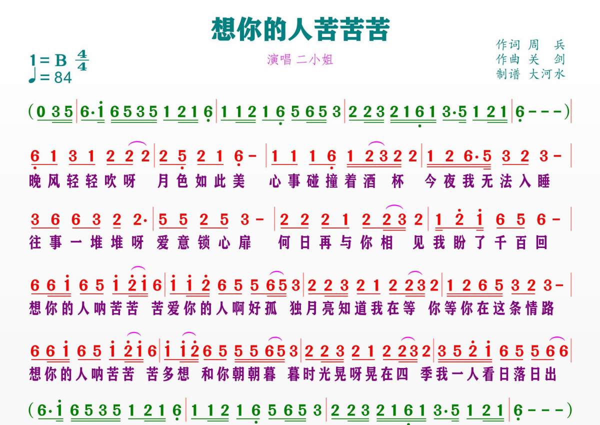 想你的人苦苦苦简谱 - 二小姐演唱