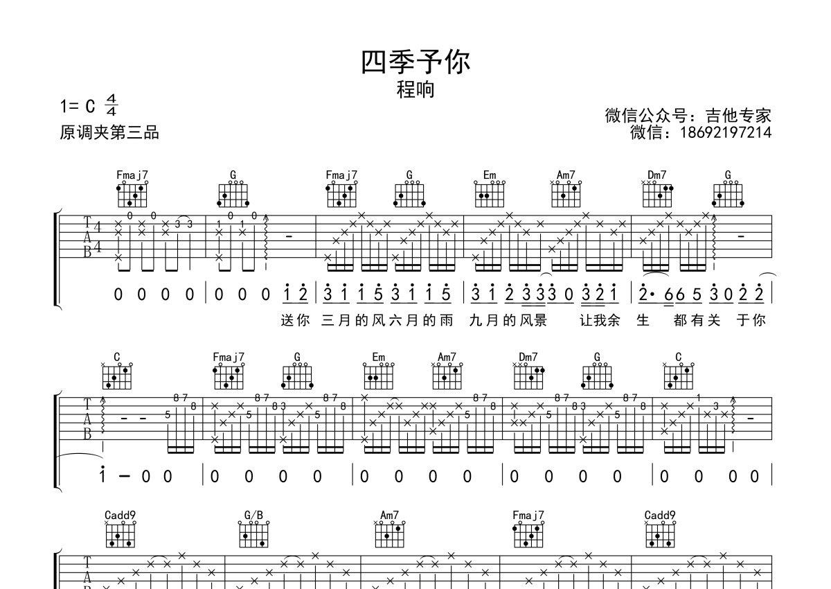 程响《四季予你》吉他谱 - C调弹唱六线谱