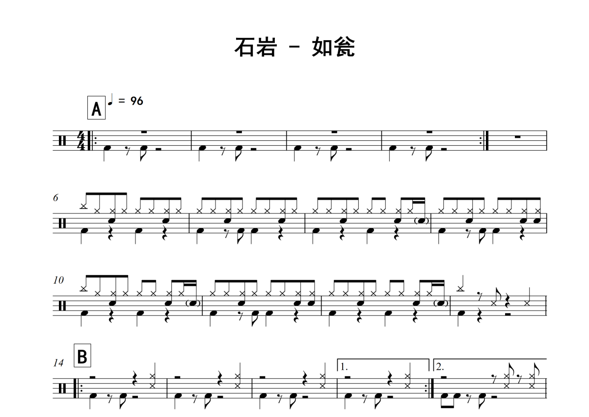 《如瓮》是石岩演唱的一首歌曲,拍号为4/4拍,歌曲速度为每分钟96拍,这份架子鼓谱共有两张高清图谱,图谱由 @老虎不说谎 编配上传,图谱使用五线谱编配,使用这份如瓮架子鼓谱,你将能够轻松地敲打出这首石岩的如瓮,快来尝试吧。