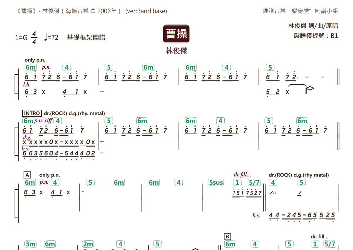 “乐厨堂”乐谱发布小组: 出版级乐谱扒谱制谱——以职业乐手圈通行标准记谱,遵循原版和声、伴奏元素和段落结构。 ❶ 2.0多功能专业团谱:采用台湾卓著公司开创的二代简谱标准制作。二代简谱无疑是迄今为止最科学、最易读的专业范畴多功能记谱方案:❷ 框架谱:采用职业乐手通常记谱方案制作。