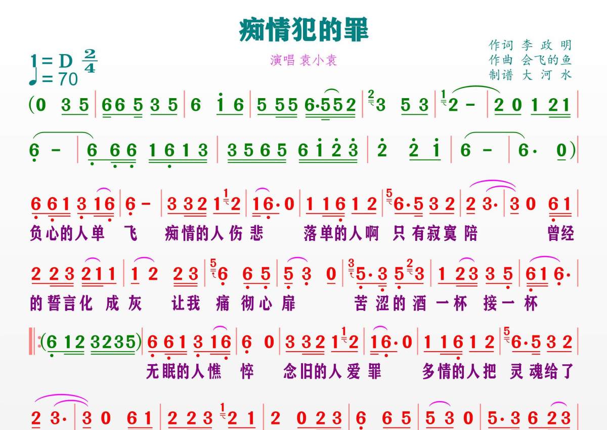 《痴情犯的罪》是袁小袁演唱的一首歌曲,这份简谱共有一张高清图谱,图谱由 @临海雪原 编配上传。