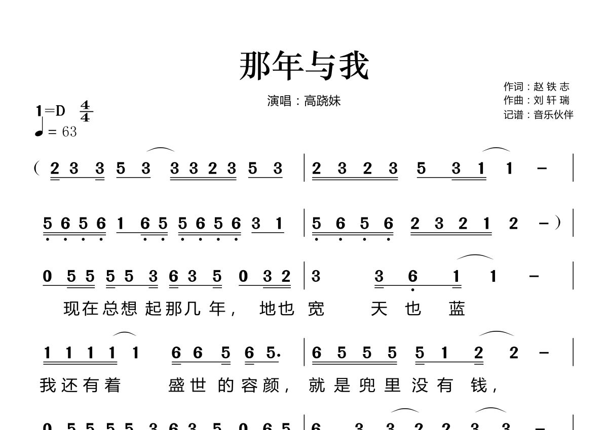 《那年与我》是高跷妹演唱的一首歌曲,拍号为4/4拍,歌曲速度为每分钟63拍,这份简谱共有两张高清图谱,图谱由 @音乐伙伴 编配上传。