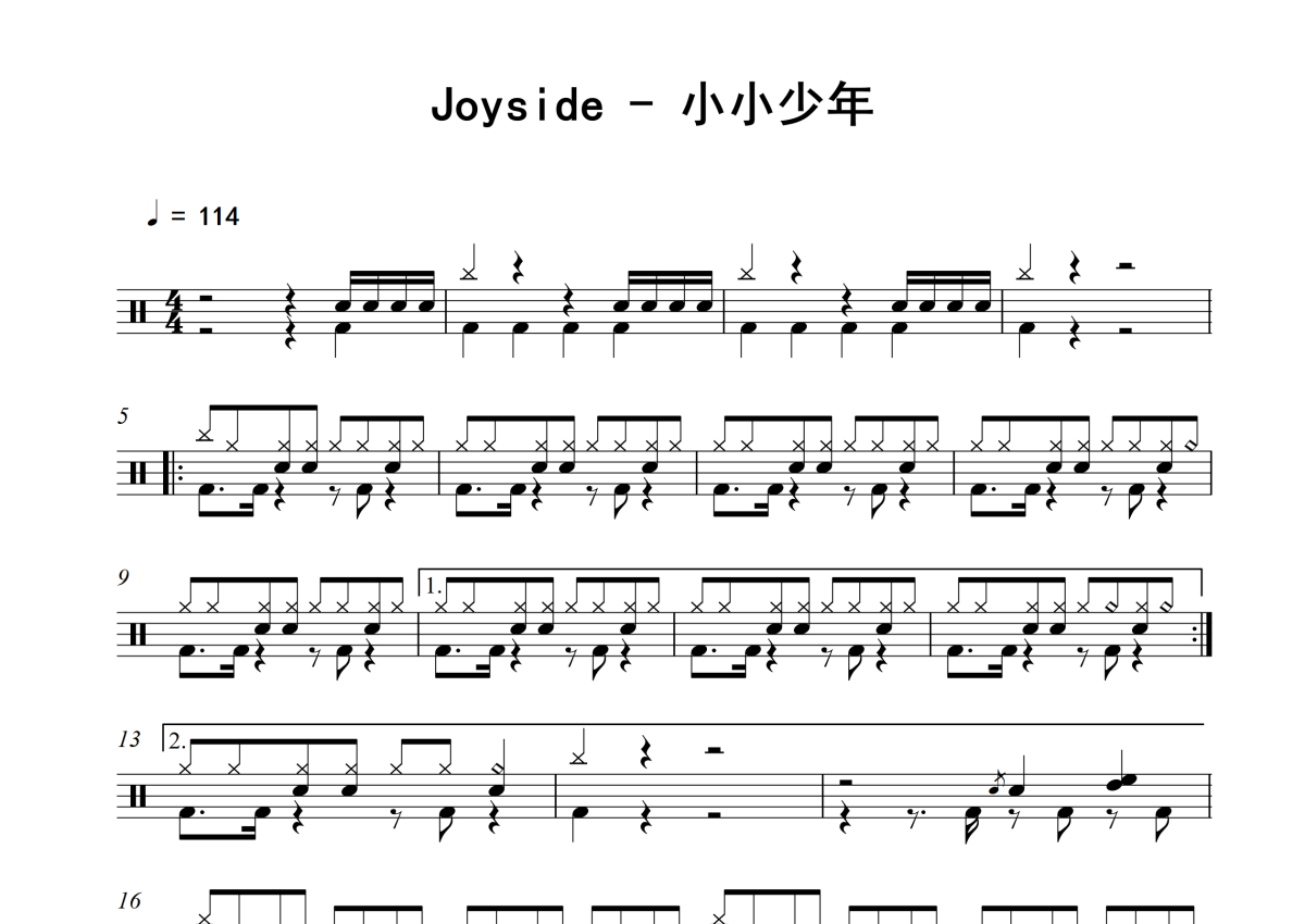 《小小少年》是Joyside演唱的一首歌曲,拍号为4/4拍,歌曲速度为每分钟114拍,这份架子鼓谱共有两张高清图谱,图谱由 @老虎不说谎 编配上传,图谱使用五线谱编配,使用这份小小少年架子鼓谱,你将能够轻松地敲打出这首Joyside的小小少年,快来尝试吧。