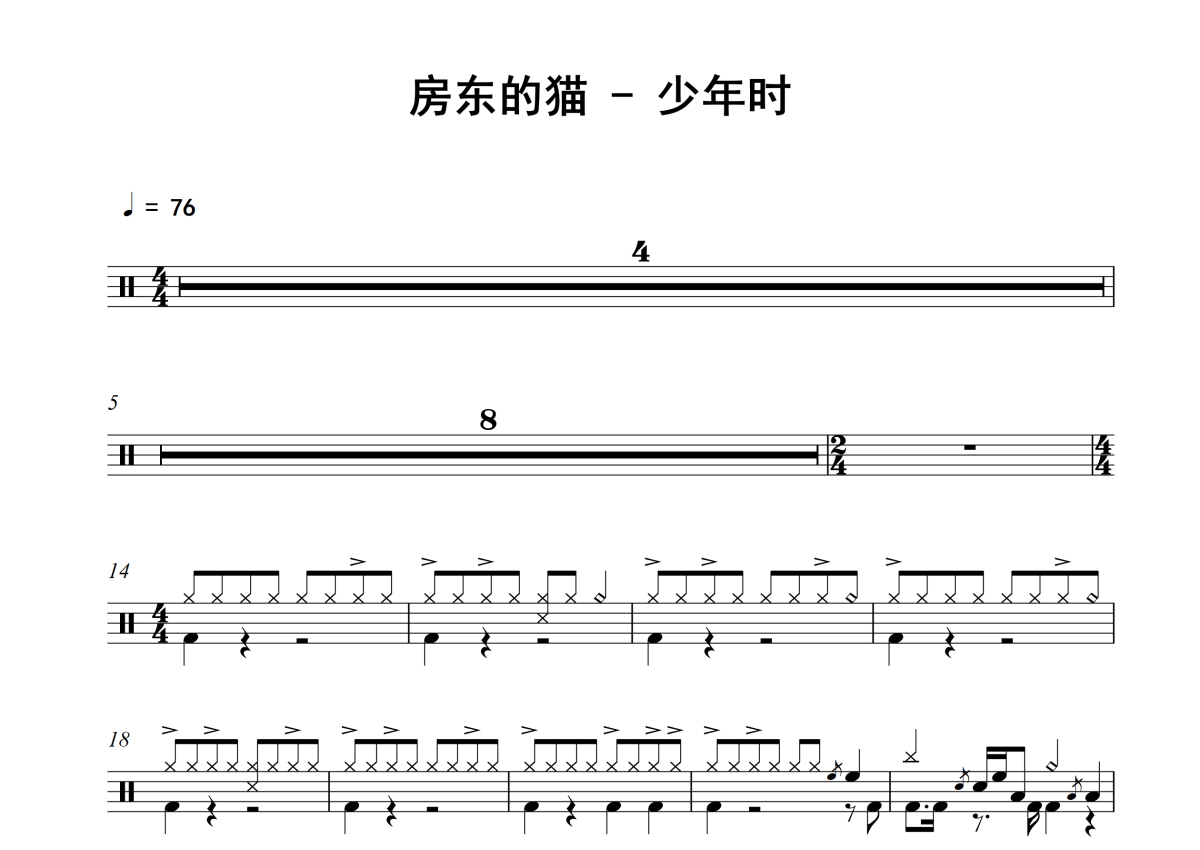《少年时》是房东的猫演唱的一首歌曲,拍号为4/4拍,歌曲速度为每分钟76拍,这份架子鼓谱共有两张高清图谱,图谱由 @老虎不说谎 编配上传,图谱使用五线谱编配,使用这份少年时架子鼓谱,你将能够轻松地敲打出这首房东的猫的少年时,快来尝试吧。