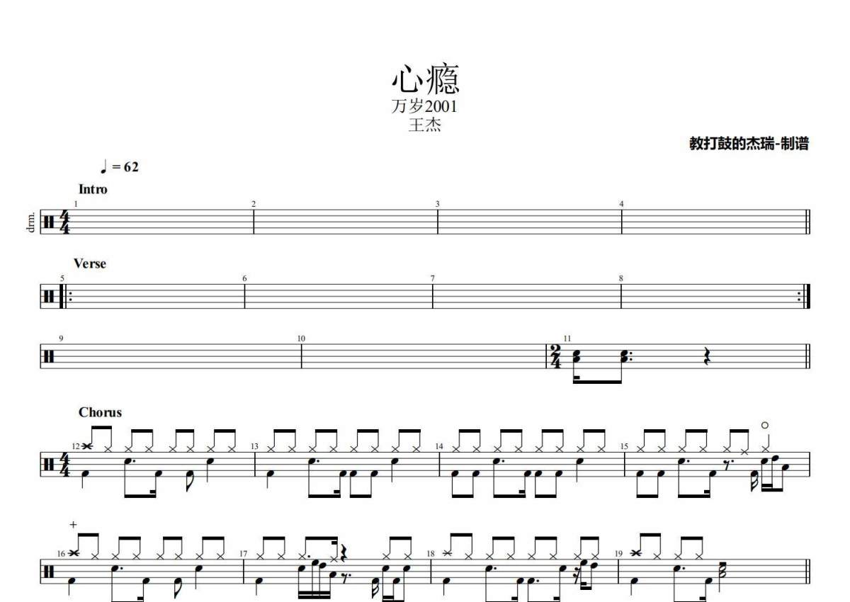 《心瘾》是王杰演唱的一首歌曲,拍号为4/4拍,歌曲速度为每分钟62拍,这份架子鼓谱共有两张高清图谱,图谱由 @Jerry 编配上传,图谱使用五线谱编配,使用这份心瘾架子鼓谱,你将能够轻松地敲打出这首王杰的心瘾,快来尝试吧。