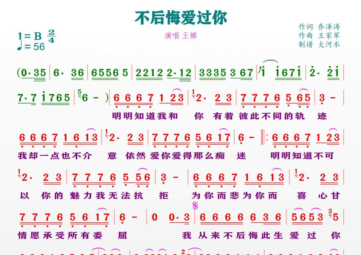 《不后悔爱过你》是王娜演唱的一首歌曲,拍号为2/4拍,歌曲速度为每分钟56拍,这份简谱共有一张高清图谱,图谱由 @临海雪原 编配上传。