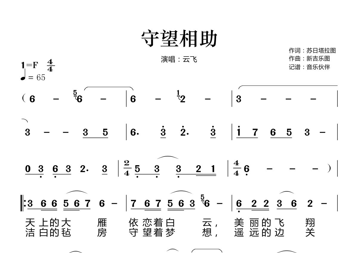 《守望相助》是云飞演唱的一首歌曲,拍号为4/4拍,歌曲速度为每分钟65拍,这份简谱共有两张高清图谱,图谱由 @音乐伙伴 编配上传。