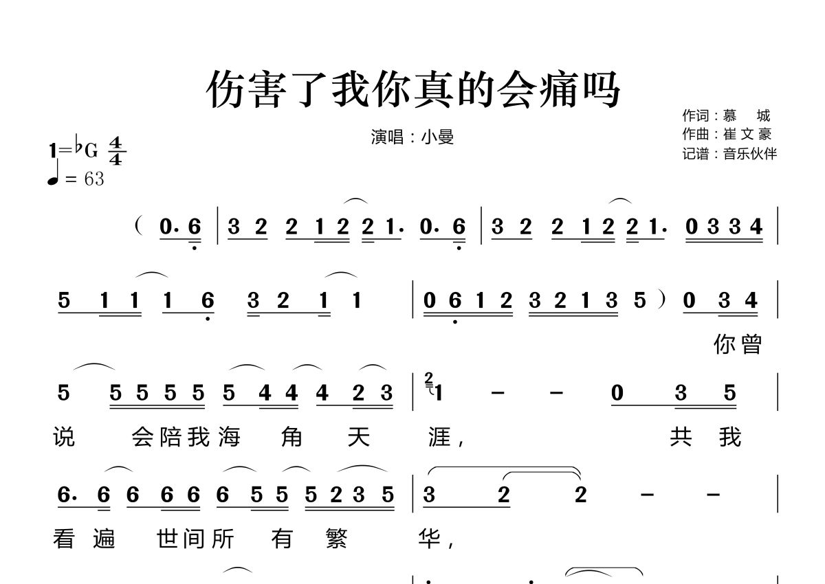 《伤害了我你真的会痛吗》是小曼演唱的一首歌曲,拍号为4/4拍,歌曲速度为每分钟63拍,这份简谱共有两张高清图谱,图谱由 @音乐伙伴 编配上传。