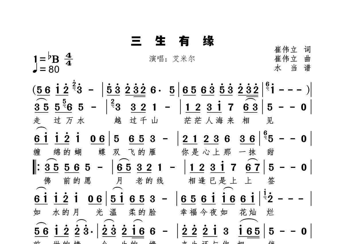 《三生有缘》是艾米尔演唱的一首歌曲,拍号为4/4拍,歌曲速度为每分钟80拍,这份简谱共有一张高清图谱,图谱由 @水当 编配上传原调bB。