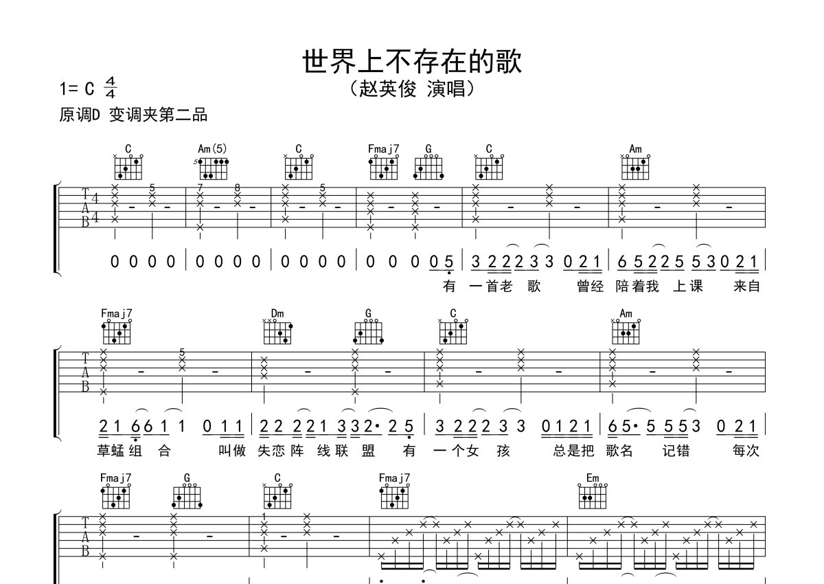 赵英俊《世界上不存在的歌》吉他谱 - C调弹唱六线谱