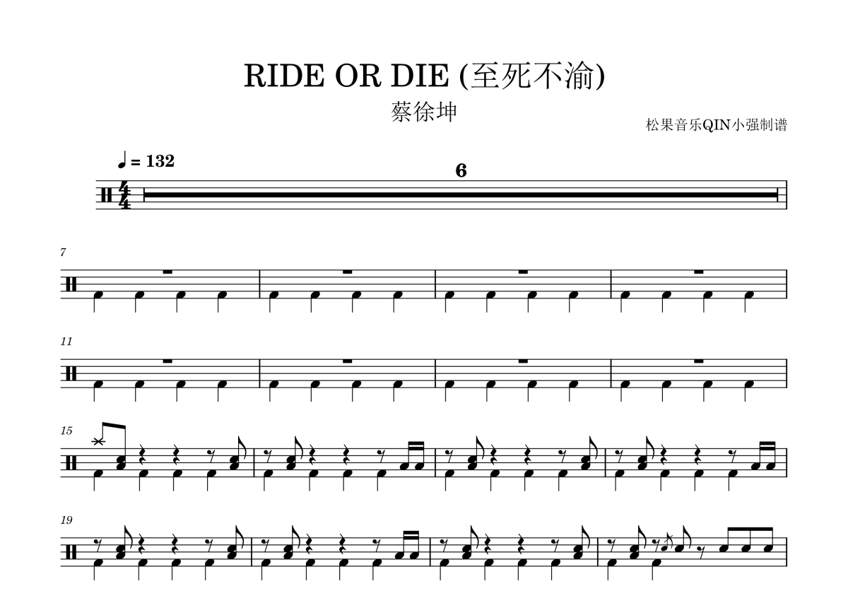 《RIDE OR DIE》是蔡徐坤演唱的一首歌曲,拍号为4/4拍,这份架子鼓谱共有两张高清图谱,图谱由 @松果音乐QIN小强 编配上传,图谱使用五线谱编配,使用这份RIDE OR DIE架子鼓谱,你将能够轻松地敲打出这首蔡徐坤的RIDE OR DIE,快来尝试吧。《RIDE OR DIE》是蔡徐坤于2024年1月31日发行的原创英文单曲,由其主导作词、作曲并担任制作人,联合Nick Anderson、CHOICE37等多位国际音乐人共同完成编曲与制作。作品创作灵感源自暴雨之夜的构思,历时三个月辗转洛杉矶、韩国、上海三地打磨,融入战鼓、风琴等元素强化末日废土质感。