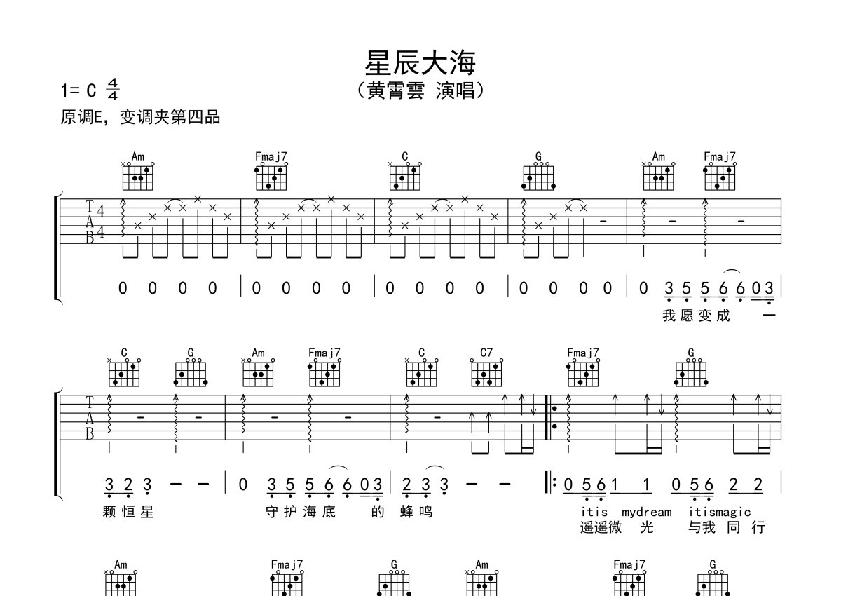 黄霄雲《星辰大海》吉他谱 - C调弹唱六线谱