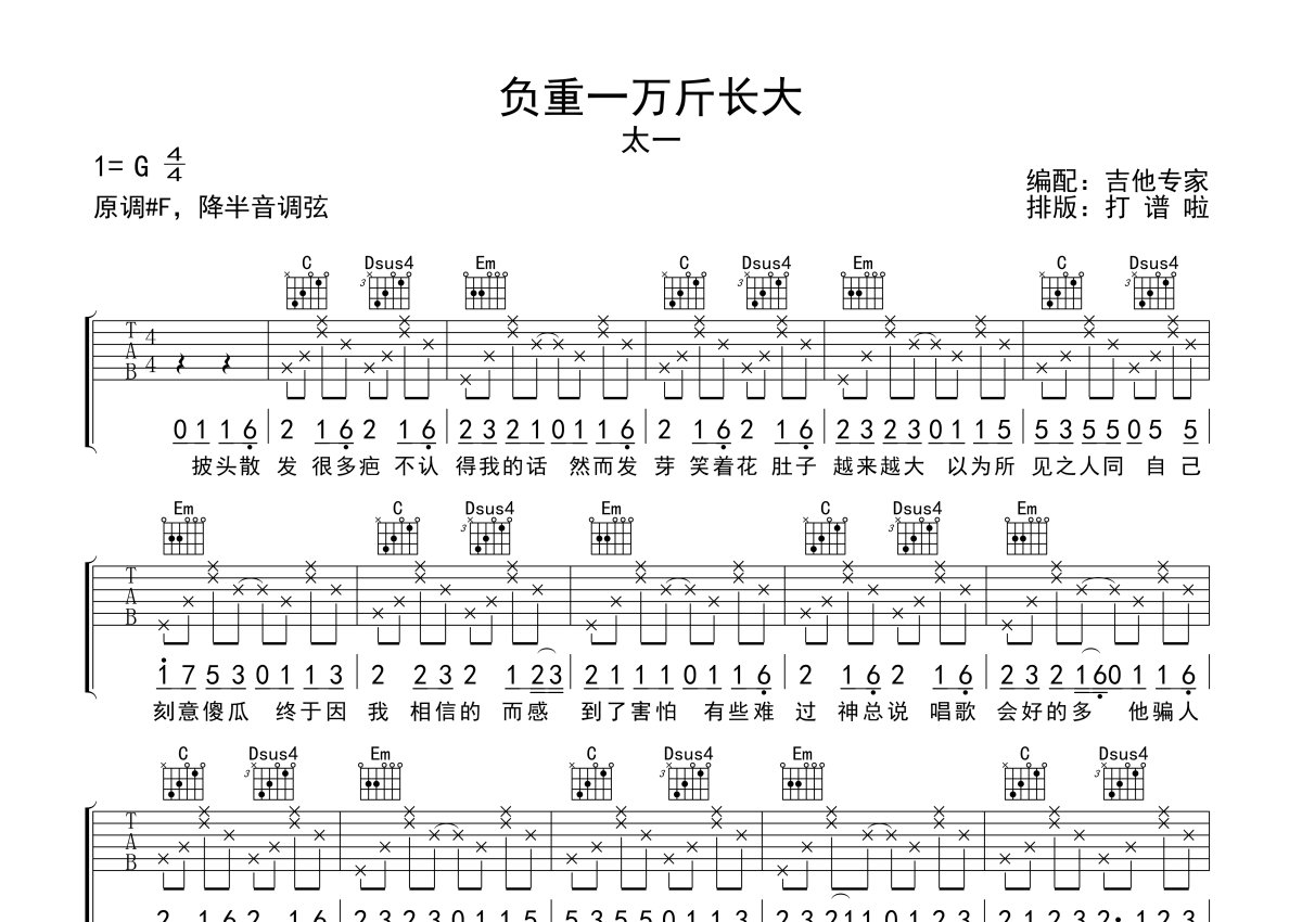 太一《负重一万斤长大》吉他谱 - G调弹唱六线谱