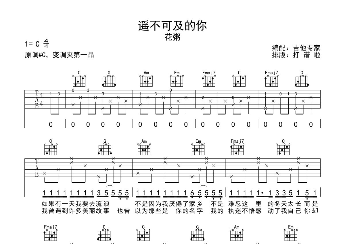 花粥《遥不可及的你》吉他谱 - C调弹唱六线谱
